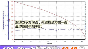 大众新捷达的制动性能也是中等的。悬架支撑正常,制动力和轮胎抓地力正常,连续十次测试后没有散热问题。42.48米的成绩并不突出,也不正常。