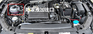 如图所示,帕萨特, 大众,的防冻液加注口位于发动机室的左上角。防冻液的更换周期为60000公里,更换容量为6L。