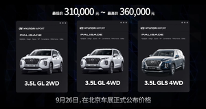 现代进口汽车帕里斯帝(PALISADE)提供三个版本,价格区间31-36万元