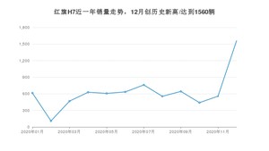 2020年12月,红旗H7销量为1560辆,环比增长180.07%。