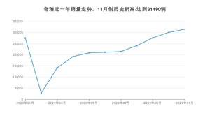 在国内市场上,奇瑞在2020年11月的销量为31480辆,同比增长30.36%,环比增长4.6%。
