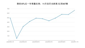 2020年11月,捷豹XFL销量为667辆,同比增长2.14%,环比增长17.02%。