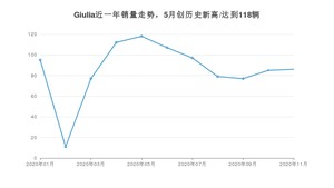 2020年11月,Giulia销量为86辆,同比增长45.76%,环比增长1.18%。