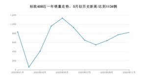 2020年11月,标致408销量为822辆,同比下降11.14%,环比增长7.03%。