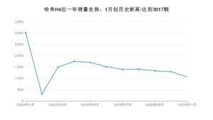2020年11月,哈弗H4销量为1059辆,同比下降50.12%,环比下降18.03%。