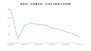 2020年11月,瑞虎3销量为131辆,同比下降84.99%,环比下降38.79%。