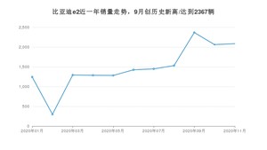 2020年11月,比亚迪e2销量为2085辆,同比增长9.39%,环比增长1.12%。