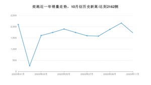 2020年11月,奕跑销量为1726辆,同比下降36.64%,环比下降20.17%。