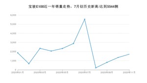 2020年11月,宝骏E100销量为1709辆,同比下降44.33%,环比增长26.59%。