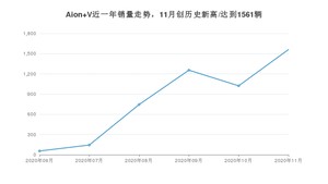 2020年11月,Aion V销量为1561辆,环比增长52.59%。