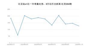 2020年11月,比亚迪e1销量为125辆,同比下降55.83%,环比下降14.38%。