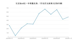 2020年11月,比亚迪e3销量为486辆,同比增长50.46%,环比增长13.82%。