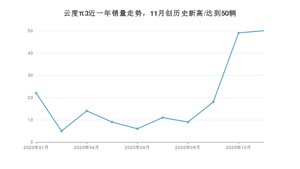2020年11月,云度π3销量为50辆,同比增长354.55%,环比增长2.04%。