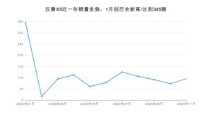2020年11月,汉腾X5销量为96辆,同比下降79.18%,环比增长31.51%。