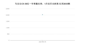 2021年1月,马自达品牌总体销量达到22035辆,其中马自达CX-30销量达到2033辆,占品牌总销量的9.23%。