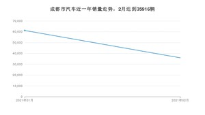 2021年2月,成都市汽车总销量为35916辆,同比增长405.08%,环比下降41.29%。1-2月份,成都市总销量为97093辆,同比增长65.78%。在最近1年中,成都市销量在2021年01月达到最高,销量为61177辆。