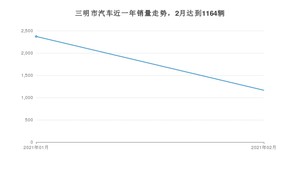 2021年2月,三明市汽车总销量为1164辆,同比增长308.42%,环比下降50.91%。1-2月份,三明市总销量为3535辆,同比增长62.98%。在最近1年中,三明市销量在2021年01月达到最高,销量为2371辆。