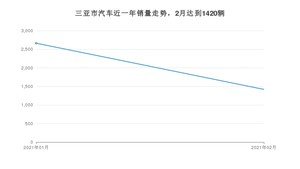 2021年2月,三亚市汽车总销量为1420辆,同比增长1%,环比下降46.7%。1-2月份,三亚市总销量为4084辆,同比增长122.2%。在最近1年中,三亚市销量在2021年01月达到最高,销量为2664辆。