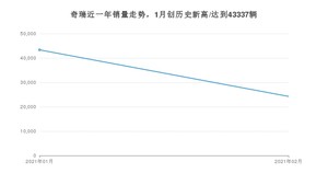 在国内市场上,奇瑞在2021年2月的销量为24263辆,同比增长783.58%,环比下降44.01%。1-2月份,奇瑞累计销量为67600辆,较去年同期增长123.47%。