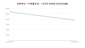 2021年2月,帕萨特销量为11477辆,同比增长773.44%,环比下降29.14%。1-2月份,帕萨特销量为27673辆,同比增长53.13%。在最近1年中,帕萨特销量在2021年01月达到最高,销量为16196辆。