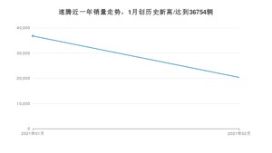 2021年2月,速腾销量为20330辆,同比增长688.6%,环比下降44.69%。1-2月份,速腾销量为57084辆,同比增长82.12%。在最近1年中,速腾销量在2021年01月达到最高,销量为36754辆。