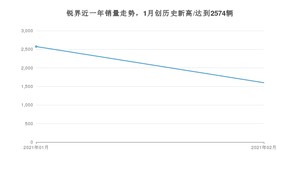2021年2月,锐界销量为1600辆,同比增长688.18%,环比下降37.84%。1-2月份,锐界销量为4174辆,同比增长34.78%。在最近1年中,锐界销量在2021年01月达到最高,销量为2574辆。