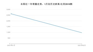2021年2月,名图销量为964辆,同比增长124.71%,环比下降63.15%。1-2月份,名图销量为3580辆,同比下降37.59%。在最近1年中,名图销量在2021年01月达到最高,销量为2616辆。