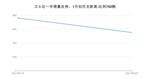 2021年2月,卫士销量为551辆,环比下降27.5%。1-2月份,卫士销量为1311辆,同比增长131%。在最近1年中,卫士销量在2021年01月达到最高,销量为760辆。
