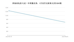 2021年2月,奔驰E级(进口)销量为663辆,同比增长605.32%,环比下降46.58%。1-2月份,奔驰E级(进口)销量为1904辆,同比增长247.45%。在最近1年中,奔驰E级(进口)销量在2021年01月达到最高,销量为1241辆。