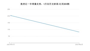 2021年2月,傲虎销量为81辆,同比增长305%,环比下降60.1%。1-2月份,傲虎销量为284辆,同比增长15.45%。在最近1年中,傲虎销量在2021年01月达到最高,销量为203辆。