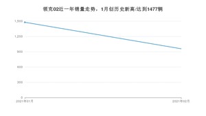2021年2月,领克02销量为957辆,同比增长254.44%,环比下降35.21%。1-2月份,领克02销量为2434辆,同比下降5.62%。在最近1年中,领克02销量在2021年01月达到最高,销量为1477辆。
