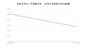 2021年2月,柯迪亚克销量为539辆,同比增长259.33%,环比下降46.42%。1-2月份,柯迪亚克销量为1545辆,同比下降8.36%。在最近1年中,柯迪亚克销量在2021年01月达到最高,销量为1006辆。