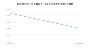2021年2月,长安CS75销量为20972辆,同比增长539.78%,环比下降51.72%。1-2月份,长安CS75销量为64408辆,同比增长101.4%。在最近1年中,长安CS75销量在2021年01月达到最高,销量为43436辆。