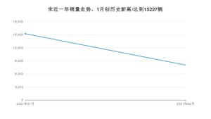 2021年2月,宋销量为8033辆,同比增长543.15%,环比下降47.25%。1-2月份,宋销量为23260辆,同比增长46%。在最近1年中,宋销量在2021年01月达到最高,销量为15227辆。
