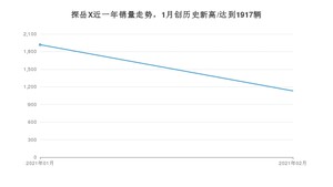 2021年2月,探岳X销量为1131辆,环比下降41%。1-2月份,探岳X销量为3048辆,在最近1年中,探岳X销量在2021年01月达到最高,销量为1917辆。