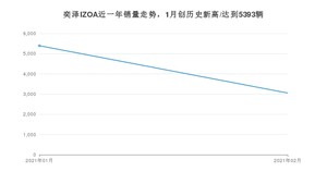 2021年2月,奕泽IZOA销量为3054辆,同比增长848.45%,环比下降43.37%。1-2月份,奕泽IZOA销量为8447辆,同比增长164.38%。在最近1年中,奕泽IZOA销量在2021年01月达到最高,销量为5393辆。