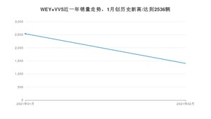 2021年2月,WEY VV5销量为1402辆,同比增长352.26%,环比下降44.72%。1-2月份,WEY VV5销量为3938辆,同比增长4.04%。在最近1年中,WEY VV5销量在2021年01月达到最高,销量为2536辆。