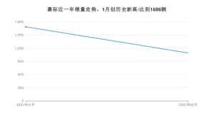 2021年2月,嘉际销量为1091辆,同比增长127.29%,环比下降35.29%。1-2月份,嘉际销量为2777辆,同比下降4.44%。在最近1年中,嘉际销量在2021年01月达到最高,销量为1686辆。
