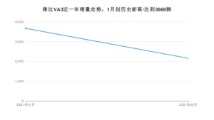 2021年2月,捷达VA3销量为2157辆,同比增长817.87%,环比下降41.21%。1-2月份,捷达VA3销量为5826辆,同比增长56.28%。在最近1年中,捷达VA3销量在2021年01月达到最高,销量为3669辆。