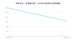 2021年2月,柯珞克销量为1595辆,同比增长693.53%,环比下降46.11%。1-2月份,柯珞克销量为4555辆,同比增长89.55%。在最近1年中,柯珞克销量在2021年01月达到最高,销量为2960辆。