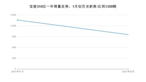 2021年2月,宝骏310销量为952辆,同比增长328.83%,环比下降29.9%。1-2月份,宝骏310销量为2310辆,同比增长37.17%。在最近1年中,宝骏310销量在2021年01月达到最高,销量为1358辆。
