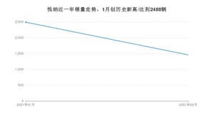 2021年2月,悦纳销量为1455辆,同比增长364.86%,环比下降41.52%。1-2月份,悦纳销量为3943辆,同比下降19.74%。在最近1年中,悦纳销量在2021年01月达到最高,销量为2488辆。