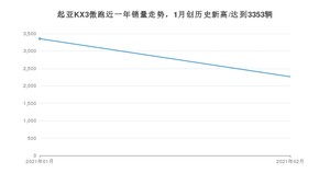 2021年2月,起亚KX3傲跑销量为2264辆,同比增长609.72%,环比下降32.48%。1-2月份,起亚KX3傲跑销量为5617辆,同比增长46.28%。在最近1年中,起亚KX3傲跑销量在2021年01月达到最高,销量为3353辆。