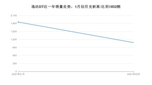 2021年2月,逸动DT销量为1082辆,同比增长190.08%,环比下降41.58%。1-2月份,逸动DT销量为2934辆,同比下降11.52%。在最近1年中,逸动DT销量在2021年01月达到最高,销量为1852辆。