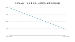2021年2月,比亚迪e3销量为173辆,同比增长458.06%,环比下降78.38%。1-2月份,比亚迪e3销量为973辆,同比增长216.94%。在最近1年中,比亚迪e3销量在2021年01月达到最高,销量为800辆。