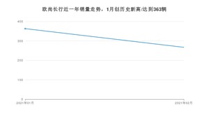 2021年2月,欧尚长行销量为267辆,同比增长444.9%,环比下降26.45%。1-2月份,欧尚长行销量为630辆,同比增长50.36%。在最近1年中,欧尚长行销量在2021年01月达到最高,销量为363辆。