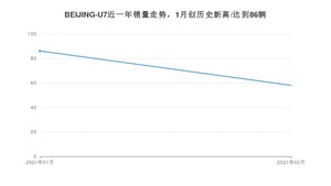2021年2月,BEIJING-U7销量为58辆,同比增长3.57%,环比下降32.56%。1-2月份,BEIJING-U7销量为144辆,同比下降76.12%。在最近1年中,BEIJING-U7销量在2021年01月达到最高,销量为86辆。