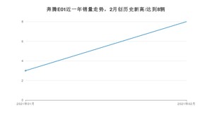 2021年2月,奔腾E01销量为8辆,环比增长166.67%。1-2月份,奔腾E01销量为11辆,在最近1年中,奔腾E01销量在2021年02月达到最高,销量为8辆。