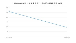 2021年2月,BEIJING-EU7销量为93辆,同比增长102.17%,环比下降64.23%。1-2月份,BEIJING-EU7销量为353辆,同比增长32.71%。在最近1年中,BEIJING-EU7销量在2021年01月达到最高,销量为260辆。