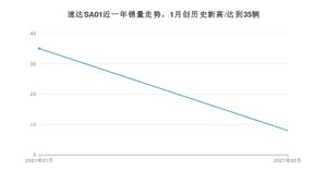 2021年2月,速达SA01销量为8辆,同比下降66.67%,环比下降77.14%。1-2月份,速达SA01销量为43辆,同比下降28.33%。在最近1年中,速达SA01销量在2021年01月达到最高,销量为35辆。